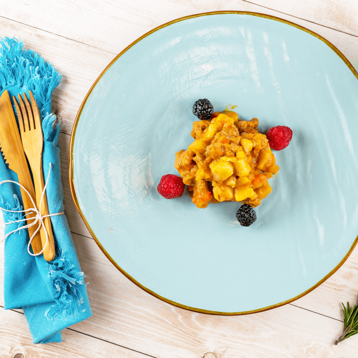 Patate (35%), fondo di verdura (cipolla, carote, sedano, olio extravergine di oliva), polpa di pomodoro, bocconcini di soia, brodo di miso (Miso di riso (fagioli di soia, riso fermentato, sale marino, acqua), sale marino, carota, acqua, cipolla, porro, alga kombu (acqua, kombu, sale marino), kuzu (amido addensante naturale), purea di zenzero, olio di girasole spremuto a freddo), vino bianco, olio di semi di girasole, olio extravergine di oliva, shoyu (acqua, soia, frumento, sale marino, koji), farina di riso integrale, brodo vegetale, sale marino integrale.